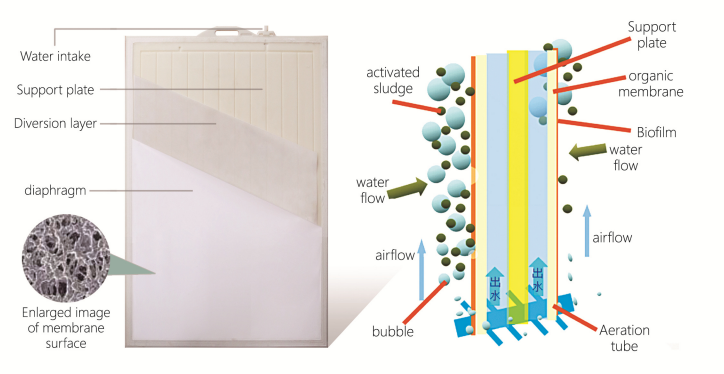 The working principle of flat-plate Membrane is: flat-plate Membrane is placed vertically in aerobic reaction tank, clear water and small molecular substances (such as salts) pass through the surface of the vertical membrane under negative pressure drainage; A certain concentration of activated sludge mixture decomposes the organic matter under the action of Aeration, and the air flow washes up the surface of the membrane, so that the sludge is not easy to pile up on the surface of the membrane, thus maintaining a constant pervious yield.